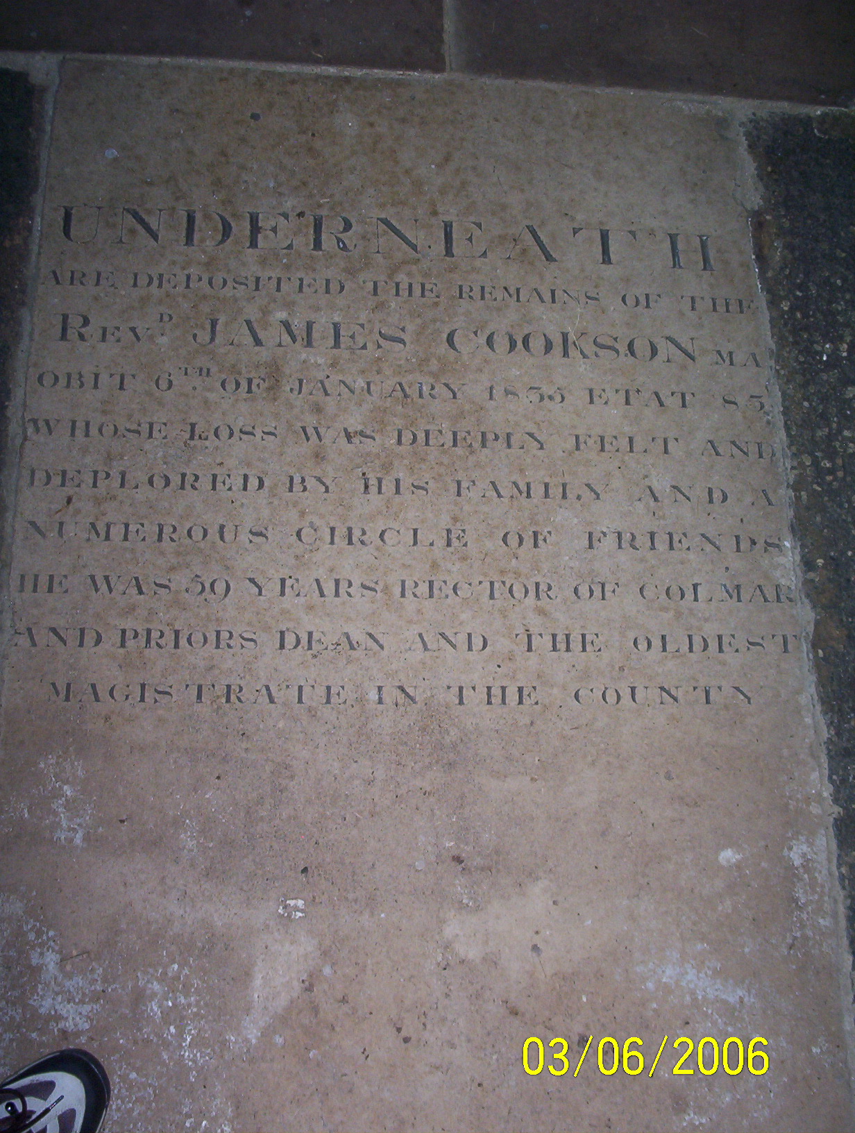 Underneath are deposited the remains of the Revd. James Cookson MA. |